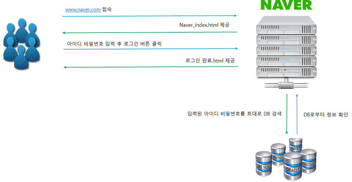 ์ฐ๋ฆฌ๊ฐ www.naver.com์ ์ ์ ์ํ๊ฒ ๋๋ค๋ฉด ๋ค์ด๋ฒ๋ ๊ฐ์ฅ ์ฒซ ํ์ด์ง๋ฅผ ์๋ฒ์์ ์น ๋ธ๋ผ์ฐ์ ์๊ฒ ์ ๊ณตํ๊ฒ ๋๋ค. ๊ทธ๋ฆฌ๊ณ ์ฐ๋ฆฌ๋ ์ฒซ ํ์ด์ง์์ id pw๋ฅผ ๋ก๊ทธ์ธ ๋ฒํผ์ ํตํด์ ์ ์ถํ๊ฒ ๋๋ฉด ๋ค์ด๋ฒ๋ ๋ฐ์ดํฐ๋ฒ ์ด์ค์์ ์ฐ๋ฆฌ์ ์ ๋ณด๋ฅผ ๊ฒ์ํ๊ณ ์ ๋ณด๋ฅผ ์ถ์ถํ์ฌ ์ฐ๋ฆฌ์๊ฒ ๋ก๊ทธ์ธ ์๋ฃ๋ฅผ ์๋ ค์ฃผ๋๋ฐ ์ด๋ฌํ ๊ณผ์ ์ด ๋ค HTTP ํต์ ์ ์ํด์ ์ด๋ฃจ์ด์ง๋ค.