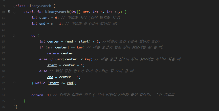 μ΄μ§ κ²μμ startμ end μ¬μ΄μ centerκ°κ³Ό κ²μνλ κ°μ λΉκ΅νλ©° κ²μ κ° λ³΄λ€ ν¬λ©΄ startμ end, centerλ₯Ό μλ‘ μ‘°μ νμ¬ κ°μ μ°Ύμλ΄λ λ°©λ²μ λ§ νλ€.