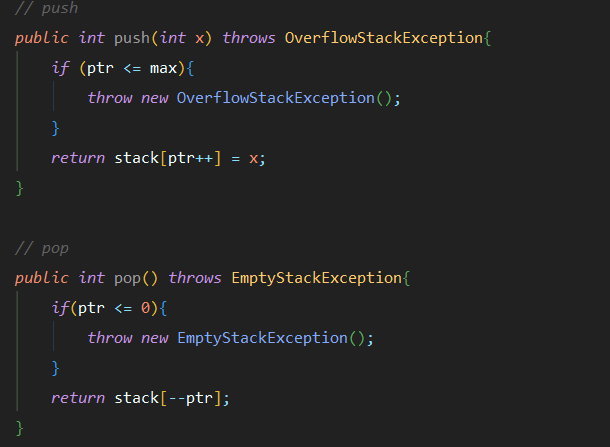 Pushμ Popμ μν΄ stack[] λ°°μ΄μ ptrμΈλ±μ€λ₯Ό μ΄μ©νμ¬ κ°μ λμ νΉμ λμ μν€λ λ©μλλ₯Ό λ€μκ³Ό κ°μ΄ λ§λ€μ΄ μ€λ€.