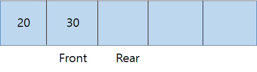 ๋ง์ฝ ํ๊ฐ ๋น์ด์๋ค๋ฉด front ์ rear์ ๊ฐ์ ๊ณณ์ ํฅํ๊ฒ ๋ ๊ฒ์ด๊ณ 20 ๊ณผ 30 ์ด๋ ๋ฐ์ดํฐ๋ฅผ ์ถ๊ฐํ๋ค๋ฉด ์ด๋ป๊ฒ ๋ณํ๋์ง ๋ด๋ณด์.