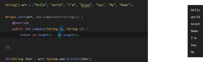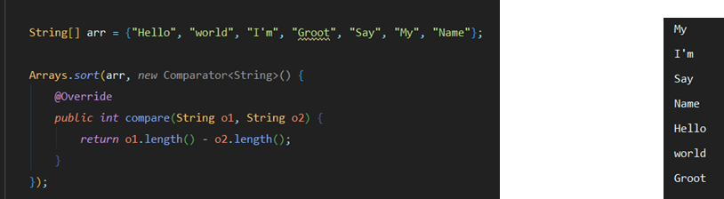 ํ์ง๋ง ์ฐจ์ด์ ์ด๋ผ๊ณ ํ๋ฉด comparabl์ ์ ๋ ฌ ๊ธฐ์ค์ด ์ผ๋ฐ์ ์ผ ๊ฒฝ์ฐ(๋ด๋ฆผ์ฐจ์) ์ผ๋ ์ฌ์ฉํ์ง๋ง comparator์ ์ ๋ ฌ ๊ธฐ์ค์ด ์ผ๋ฐ์ ์ด์ง ์์ ๋(๋ฌธ์์ด์ ๊ธธ์ด๋ฅผ ๋น๊ตํ์ฌ ์ค๋ฆ์ฐจ์, ๋ด๋ฆผ์ฐจ์์ผ๋ก ์ ์ํ ๋) ์ฌ์ฉํ๋ ๊ฒฝ์ฐ๊ฐ ๋ง๋ค.