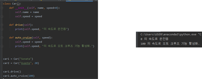 μΈμ€ν΄μ€ λ©μλμμ 첫 μΈμλ 무쑰건 self ν€μλκ° νμνλ°, μ΄ λ»μ ν΄λμ€μ μΈμ€ν΄μ€(κ°μ±)λ₯Ό λ»νλ―λ‘ selfλ₯Ό ν΅ν΄μ μΈμ€ν΄μ€ λ³μλ₯Ό λ§λ€κ³ μ¬μ©νλ€.