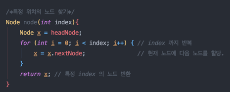 ํน์ ์์น์ ๋ ธ๋๋ฅผ ํ์ธํ๊ธฐ ์ํด์ head ๋ ธ๋์์ ๋ถํฐ ํน์ index๋งํผ ์ด๋ํ๋ค๋ฉด ํด๋น ๋ ธ๋๊ฐ ์ฐ๋ฆฌ๊ฐ ์ฐพ๊ธธ ์ํ๋ index ๋ฒ์งธ ๋ ธ๋๊ฐ ๋ ๊ฒ์ด๋ค.