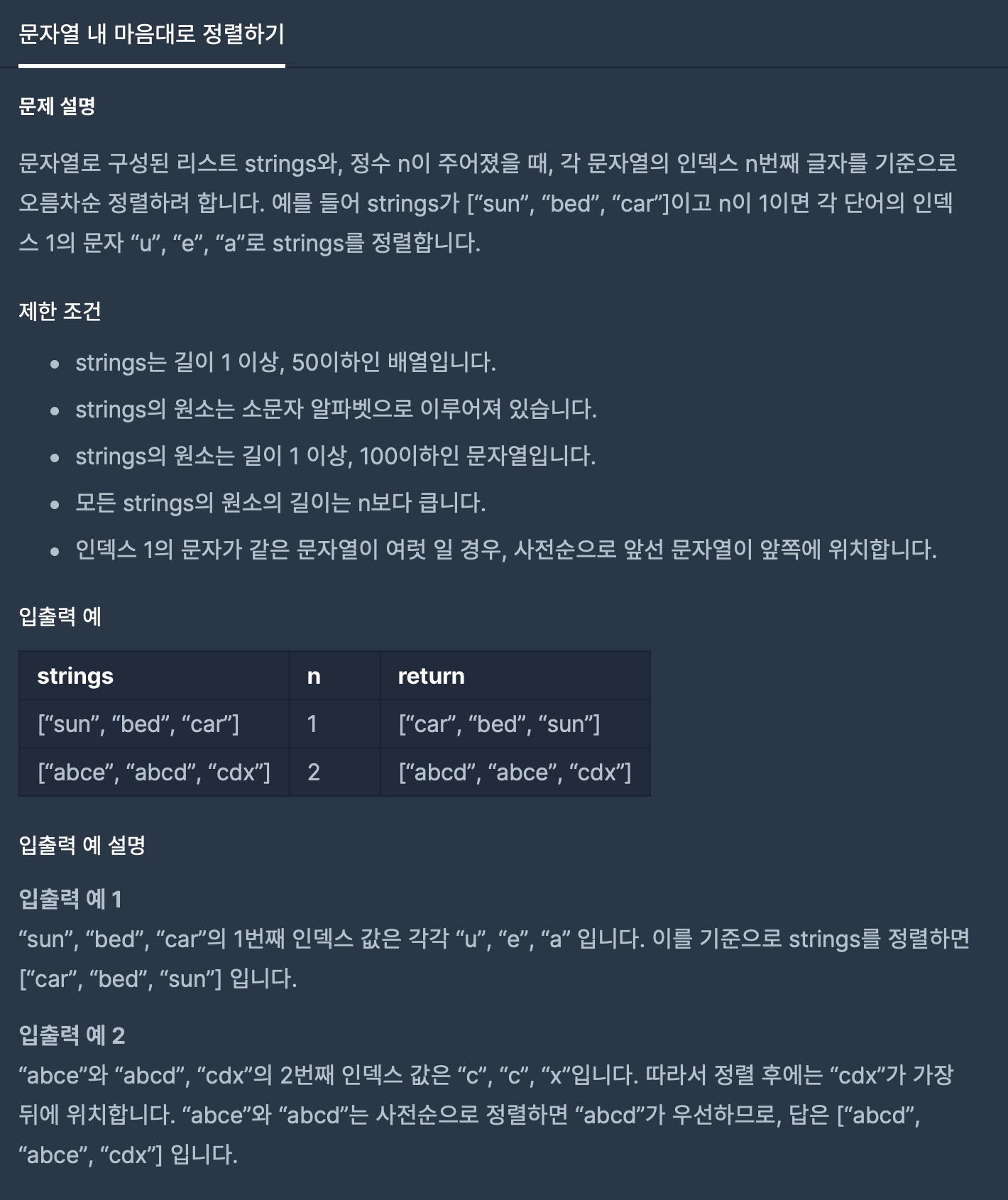 - strings์ ์์๋ ๊ธธ์ด 1 ์ด์, 100์ดํ์ธ ๋ฌธ์์ด์ ๋๋ค.