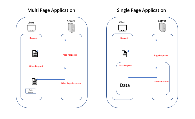 Multi page Application ๊ณผ Single Page Application์ ๋น๊ตํ์ฌ ๊ทธ๋ฆผ์ผ๋ก ๋ณด์ฌ์ฃผ์๋ฉด ๋ค์๊ณผ ๊ฐ๋ค.
