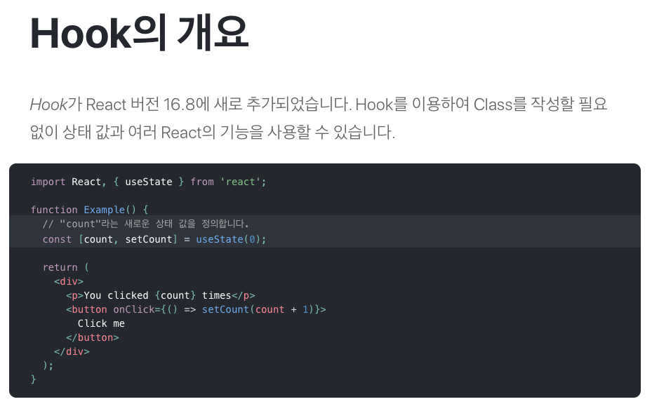 class ๋ฅผ ์์ฑํ ํ์ ์์ด ์ํ๊ฐ๊ณผ react ๊ธฐ๋ฅ์ ์ฌ์ฉํ ์ ์๊ฒ ํ๋ค๋ ๊ฒ๋ง ์์๋๋ฉด ๋ ๊ฒ ๊ฐ๋ค.