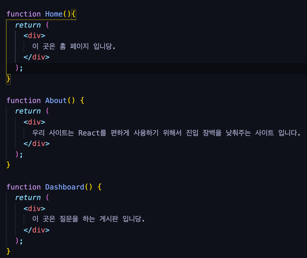์ด์ ๋์ถฉ react-router-dom ๊ตฌ์กฐ๋ฅผ ์ดํดํ์ผ๋ ์๊น ์ฒ์ ๋ดค๋ ํ์ด์ง๋ฅผ ๋ง๋ค์ด๋ณด์.