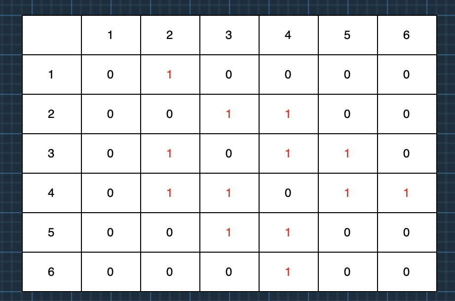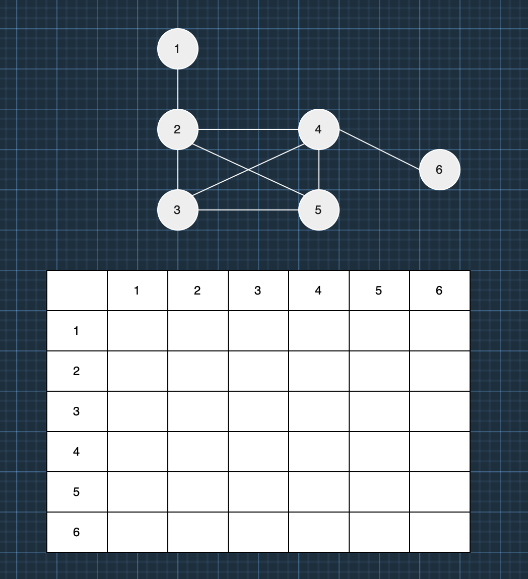 ์์ ๊ฐ์ ์ํ๋ก ๋ ธ๋๊ฐ 6๊ฐ์ด๋ฏ๋ก 6x6 ํ๋ฅผ ์ค๋นํ๋ค.