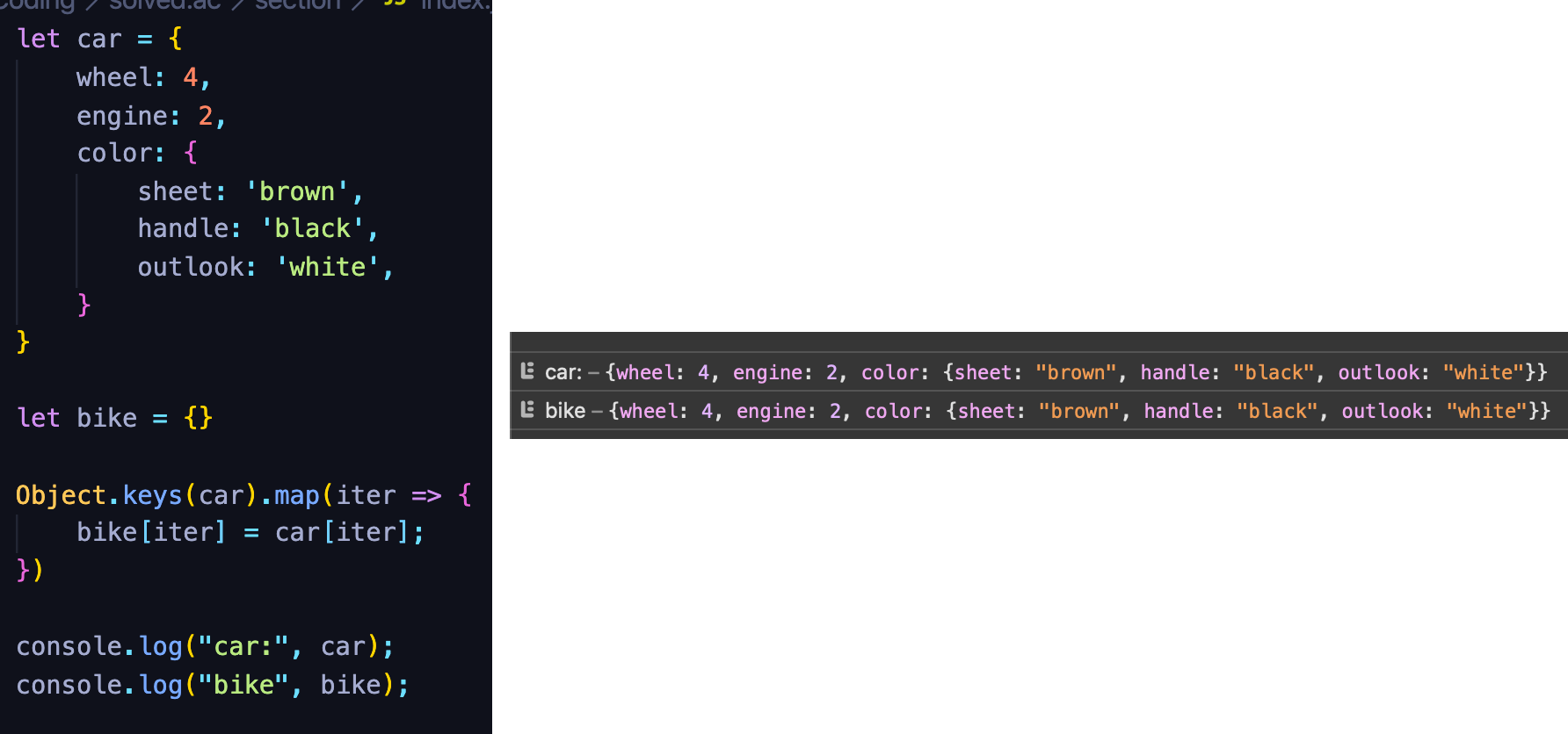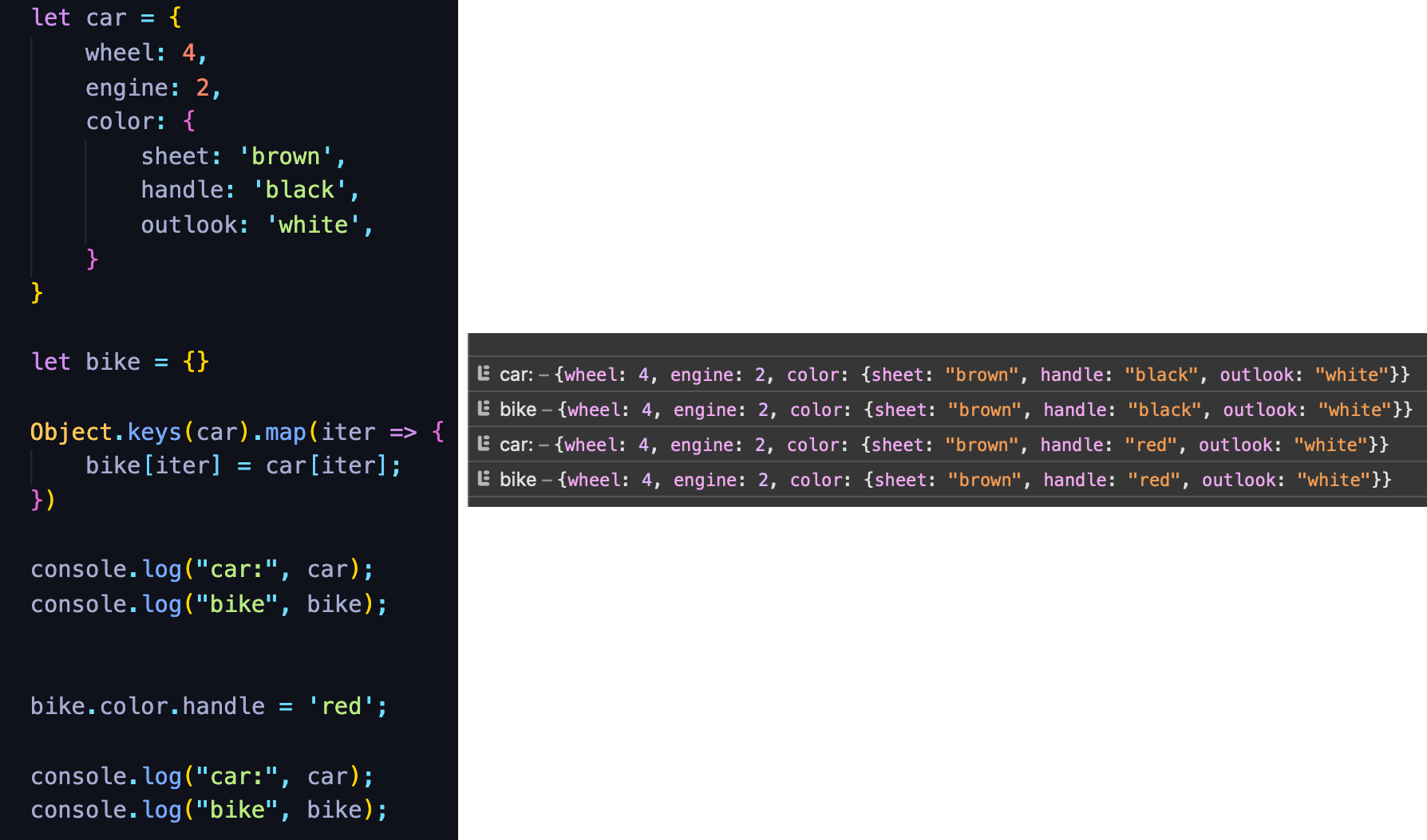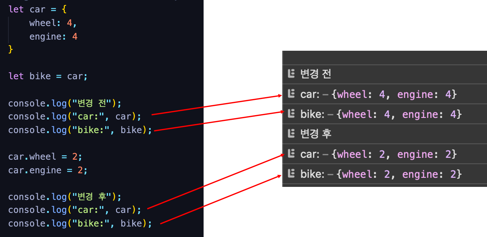 μ΄λ° μ°Έμ‘° νμ μ κ°μ΄ 볡μ¬κ° λλ κ² μλλΌ ν΄λΉ κ°μ²΄κ° μ°Έμ‘°νλ μ£Όμκ° λ³΅μ¬λΌμ λ€λ₯Έ μ°Έμ‘° λ³μ(car, bike)λΌκ³ νλλΌλ μλ‘ κ°μ κ³³μ κ°λ¦¬ν€λ©° κ²°κ΅ λ μ€ νλμ μ°Έμ‘° λ³μλ₯Ό ν΅ν΄μ κ°μ λ³κ²½νκ² λλ©΄ μλ‘ κ°μ μ£Όμλ₯Ό 곡μ νλ―λ‘ λ³κ²½λλ κ°μ κ°μμ§κ² λλ€.