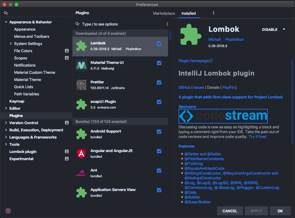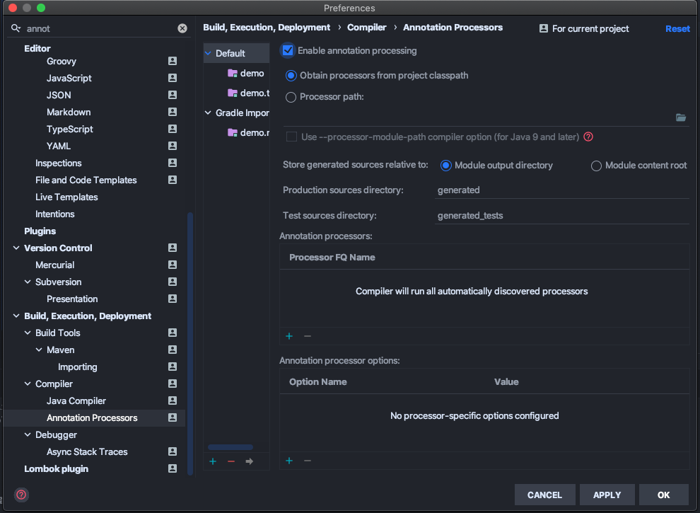 ๋กฌ๋ณต์ ์ฌ์ฉํ๊ธฐ ์ํด ํ๋ฌ๊ทธ์ธ์ ์ค์นํ๊ณ ํ๊ฒฝ ์ค์ ์์ Enable Annotation Process๋ฅผ ์ฒดํฌํ๋๋ก ํ์.