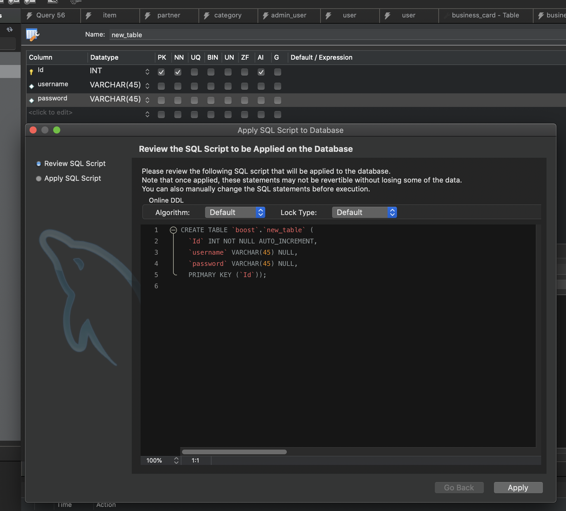 create table์์ User๋ผ๋ ์ด๋ฆ์ ํ ์ด๋ธ์ Id, username, password ๋ง ์ถ๊ฐํด๋ณด์.