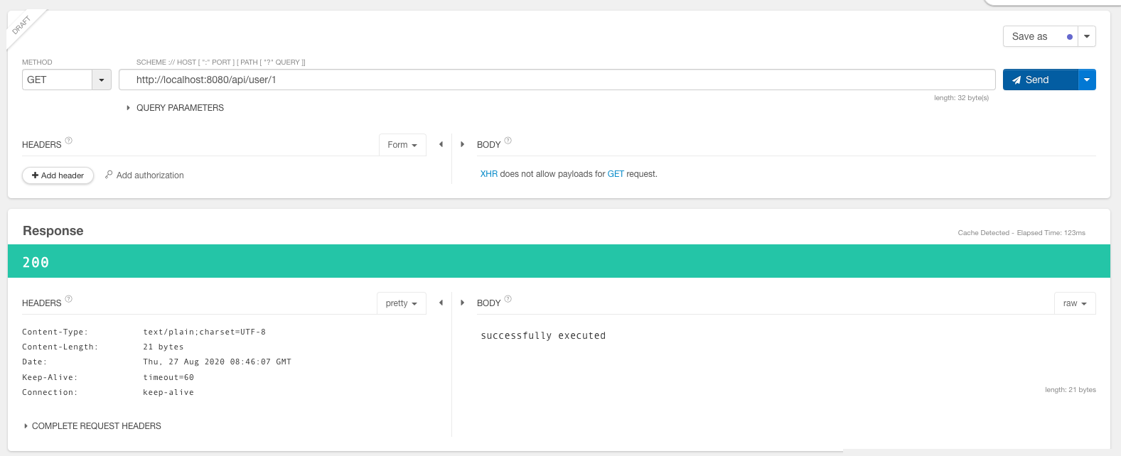 read๋ฉ์๋๋ Controller์์ ๋งคํ์ ํ๊ธธ localhost:8080/api/user/{id}๋ก ํ์์ผ๋ฏ๋ก ํด๋น URL๋ก ๋ค์ด๊ฐ๋ณด์.