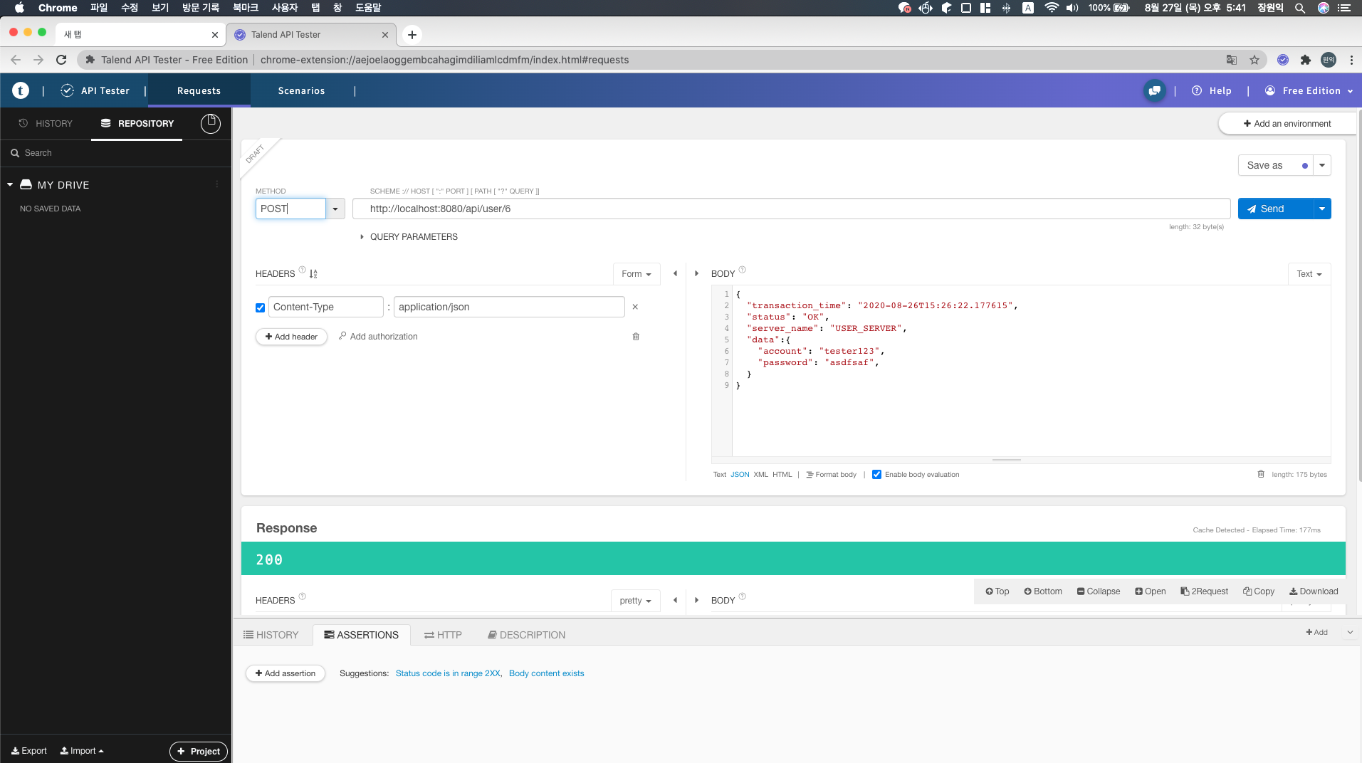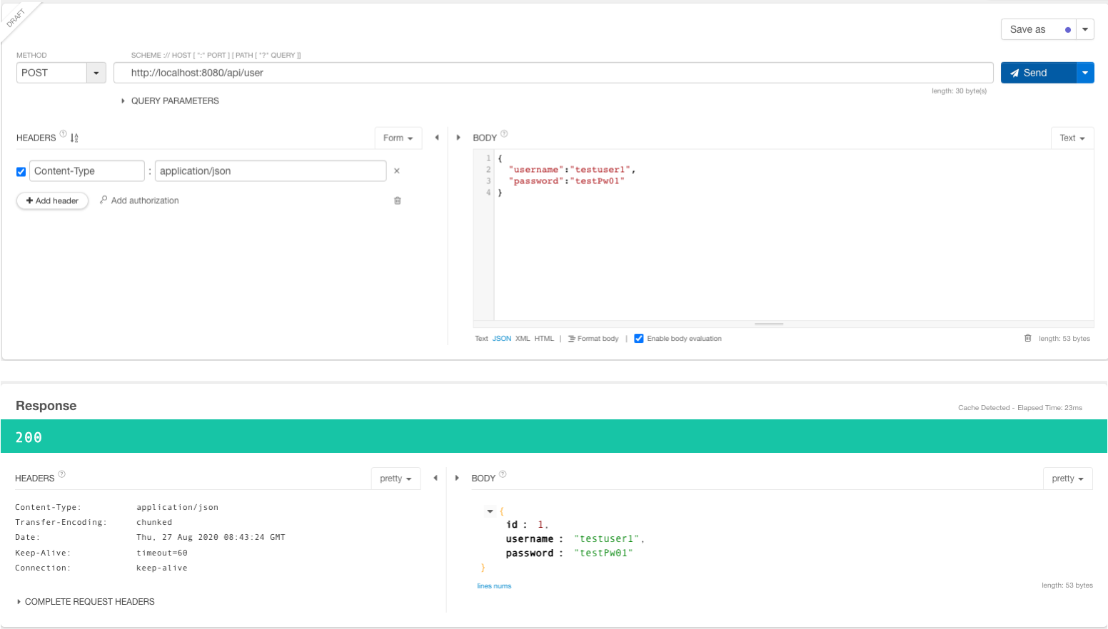 create ๋ฉ์๋๋ Controller์์ ๋งคํํ๊ธธ localhost:8080/api/user ๋ก ํ์์ผ๋ฏ๋ก ํด๋น URL์ JSON ํ๋ผ๋ฏธํฐ๋ฅผ ๋๊ฒจ๋ณด์.