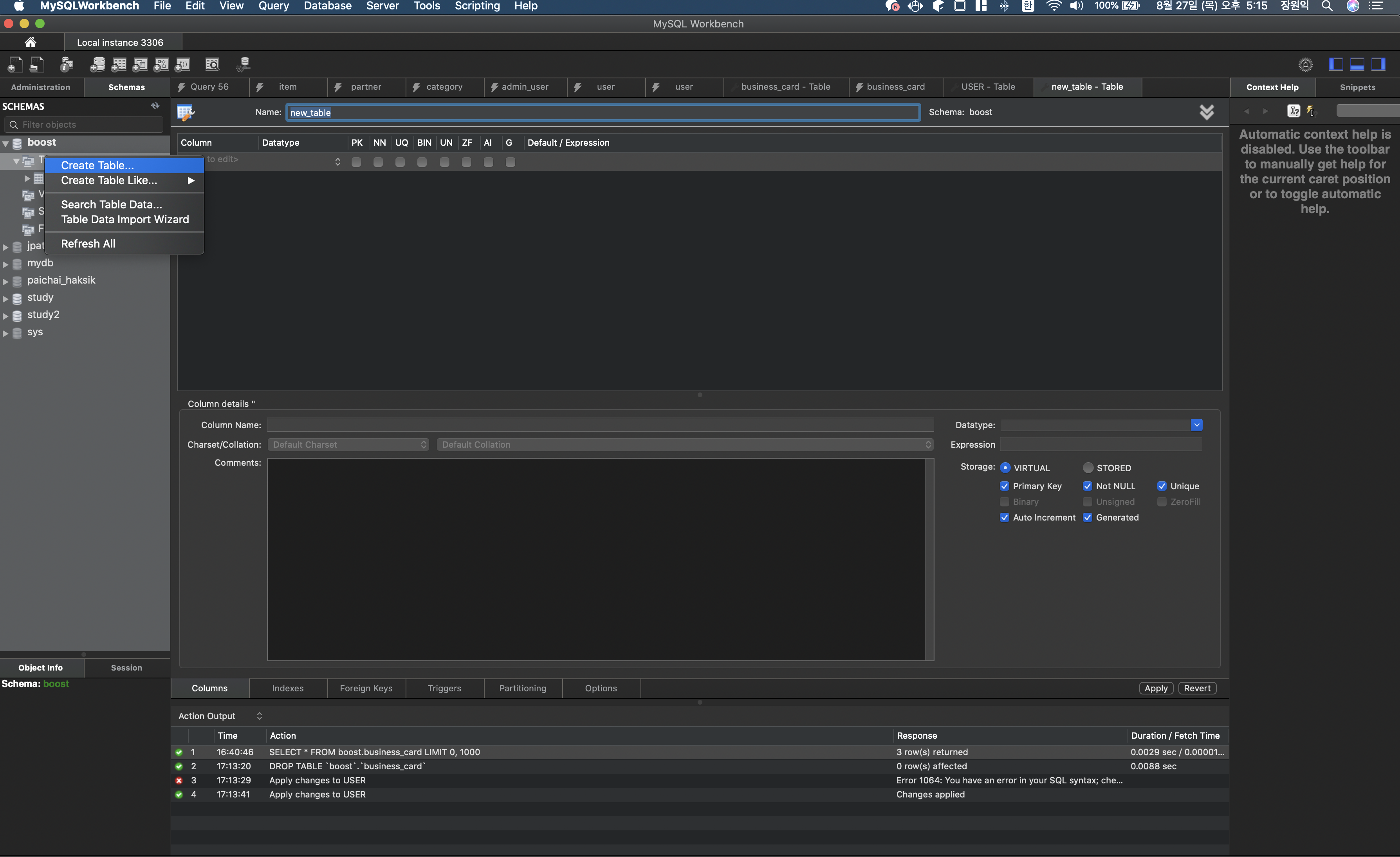 ์ด์ mysql workbench๋ก ๋ค์ด๊ฐ์ ํ ์ด๋ธ์ ๋ง๋ค์ด๋ณด์.