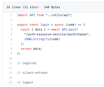 ๊ทธ๋ฆฌ๊ณ ์ค์ ๋ก ํต์ ์ ์ํ ํจ์๊ฐ ์กด์ฌํ๋ ํ์ผ์์ ๋ค์๊ณผ ๊ฐ์ด API ๋ฅผ ๋ถ๋ฌ์์ url ๋ง ๋ช ์ํด์ ์ฌ์ฉํ๊ณค ํ๋ค.