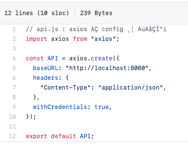 ์ค์ ๋ก ํ๋ก์ ํธ์์๋ API์ ์คํ, ์๋ฒ์ ์ฃผ์, credentials ์ค์ ์ ๋ด๋นํ๋ API.js ๋ผ๋ ํ์ผ์ ๋ง๋ค๊ณ axios ์ ๊ธฐ๋ณธ ์ค์ ์ ๋ํด์ ์ง์ ํด์ฃผ๊ณ ๊ฐ๊ฐ์ ์๋น์ค์์ ๊ฐ์ ธ๊ฐ ์ฌ์ฉํ๋ ํํ๋ก ๊ตฌํ๋๋ค.