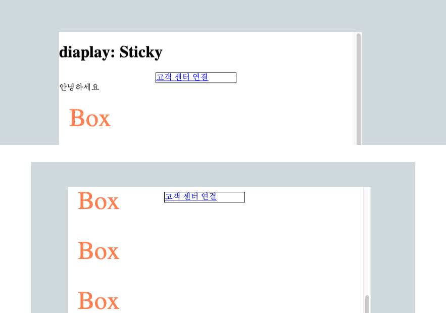 sticky ์์ฑ์ ํ์์๋ position: static ํ์์ ๋๊ณ ์์ง๋ง ์คํฌ๋กค ์์น๊ฐ ์ด๋ค ์๊ณ์ ์ ์ด๋ฅด๋ฉด position: fixed์ ๊ฐ์ด ํ๋ฉด์ ๋ฐ์ค๋ฅผ ๊ณ ์ ํ ์ ์๋ค.