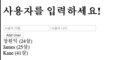 ์ฌ๊ธฐ์ username๊ณผ userAge๋ React์ Hook์ผ๋ก ๊ตฌ์ฑ๋์ด ์๋ค.