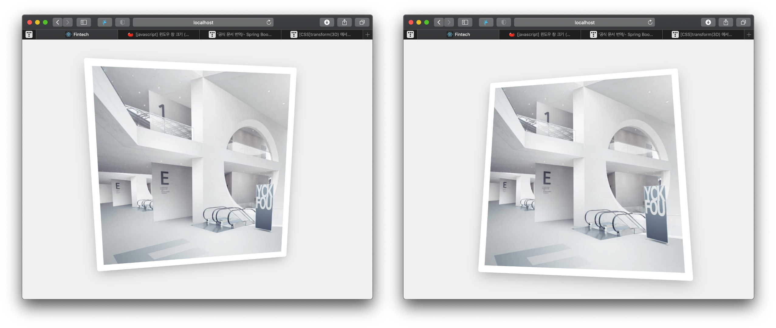 ํ์ฌ window์ฐฝ์ ๋์ด์ ๋๋น์ ์ค์ ๊ฐ๊ณผ ์์ง์์ ์์กด ๊ฐ๋ค์ ์ ๋ฐฐ์ด๋ก ๋ง๋ค์ด์ฃผ๊ณ , transํจ์๋ก css์ perspective ์ฝ๋๋ฅผ ์ฝ์ ํด์ค๋ค.