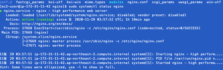 ๊ทธ๋ฆฌ๊ณ ์ค๋ฅ๊ฐ ์์ด ์ ๋ง์ณค๋ค๋ฉด, sudo systemctl status nginx ๋ช