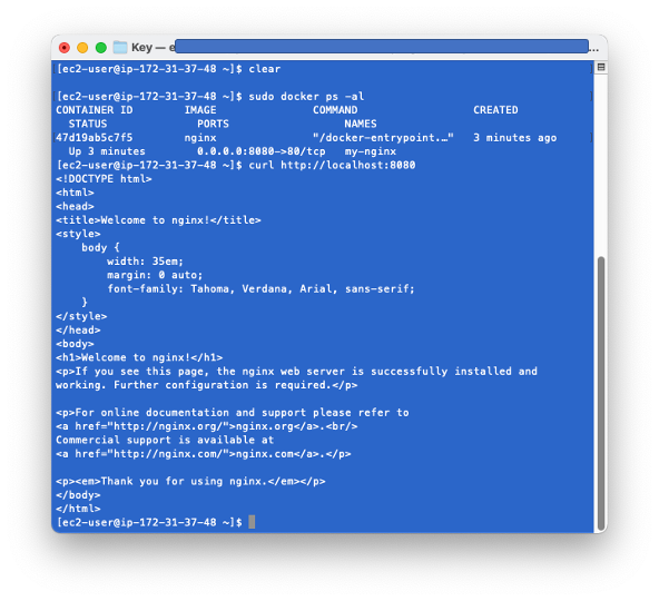 ์ผ๋ก ์ ์ํ๋ฉด ๋ค์๊ณผ ๊ฐ์ด ์ฑ๊ณต์ ์ผ๋ก Nginx๋ก ๋ง๋ค์ด์ง ๋์ปค๊ฐ ์ ์ฌ๋ผ์์์ ์ ์ ์๊ณ , docker ps๋ก๋ ์ ๋์ํ๋ ๊ฒ์ ํ์ธํ ์ ์๋ค.