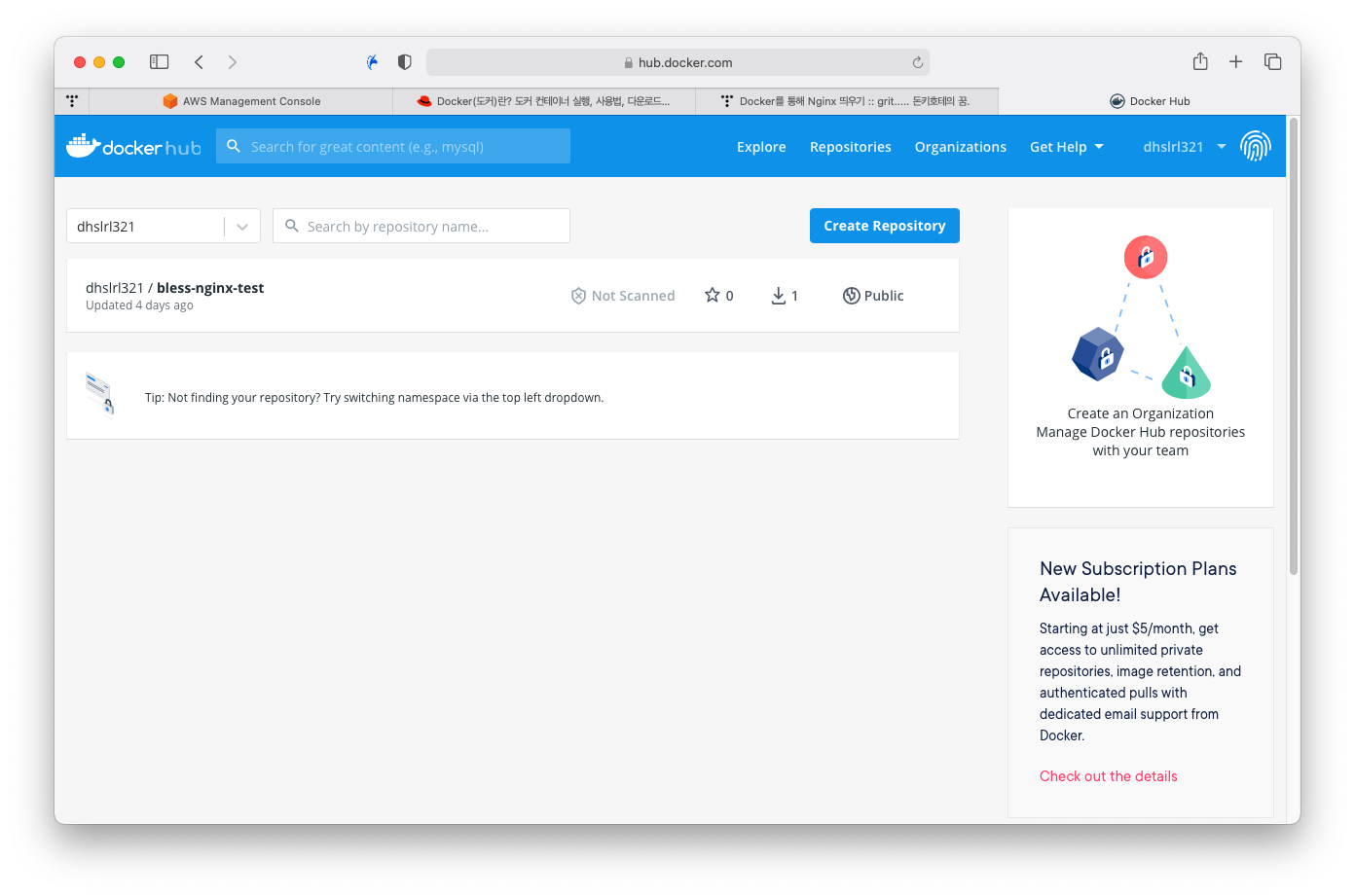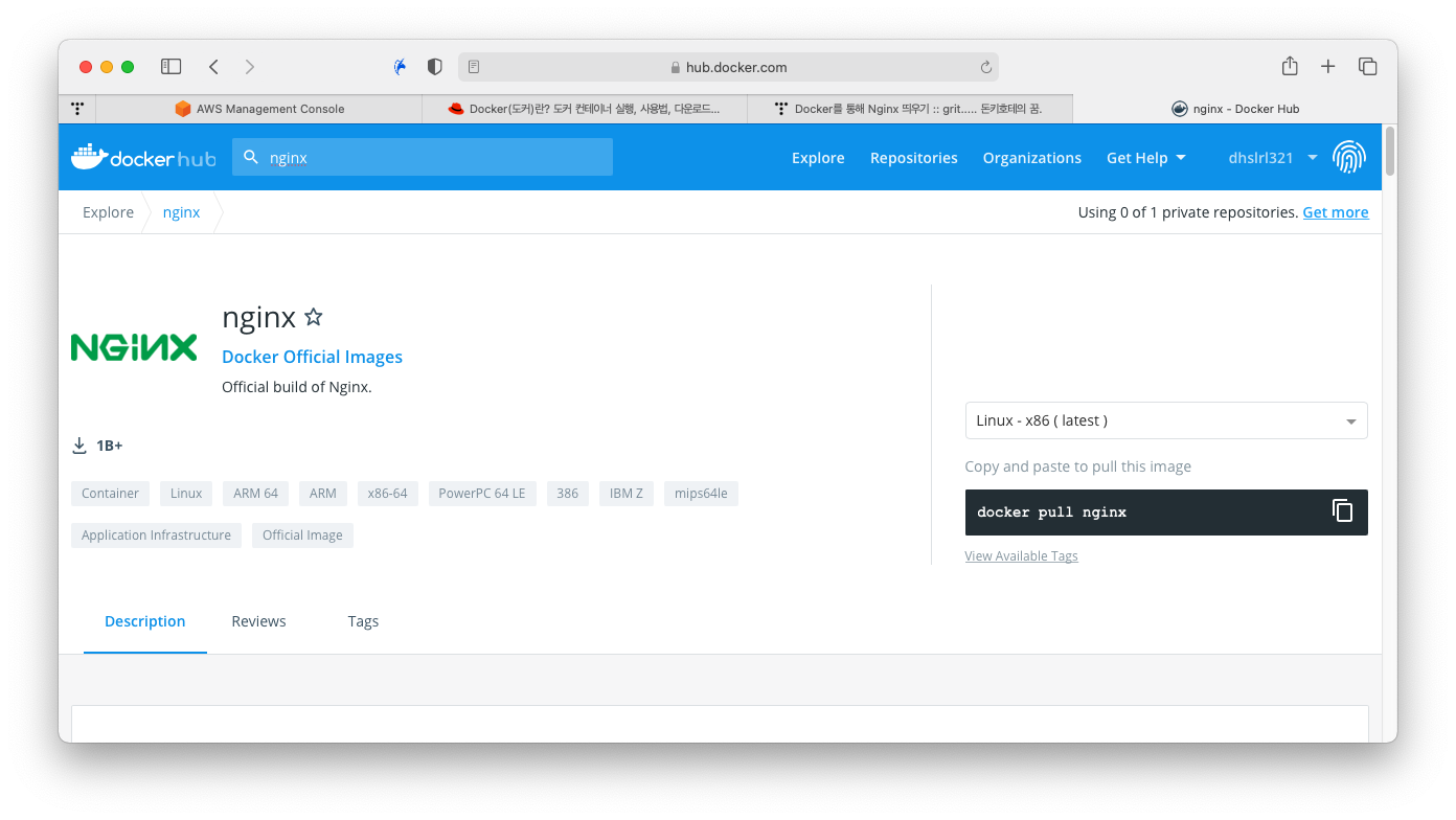 ์ฐ์ nginx ์ด๋ฏธ์ง๋ฅผ ๋ค์ด๋ก๋๋ฐ๊ธฐ ์ํด dockerhub์ ์ ์ํ๊ณ .