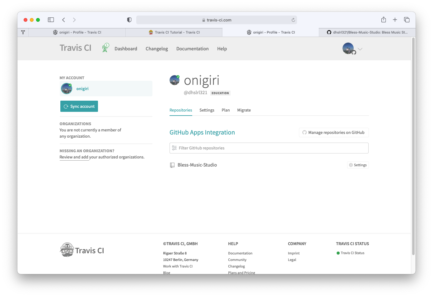 ์ฐ์ Travis-CI์ Github๋ฅผ ์ฐ๊ฒฐํ๊ธฐ ์ํด ๊ฐ๊ฐ์ ํ์ด์ง์ ํ์๊ฐ์ ์ ๋ฏธ๋ฆฌ ์งํํด์ฃผ๋ ๊ฒ์ ์ถ์ฒํ๋ค.