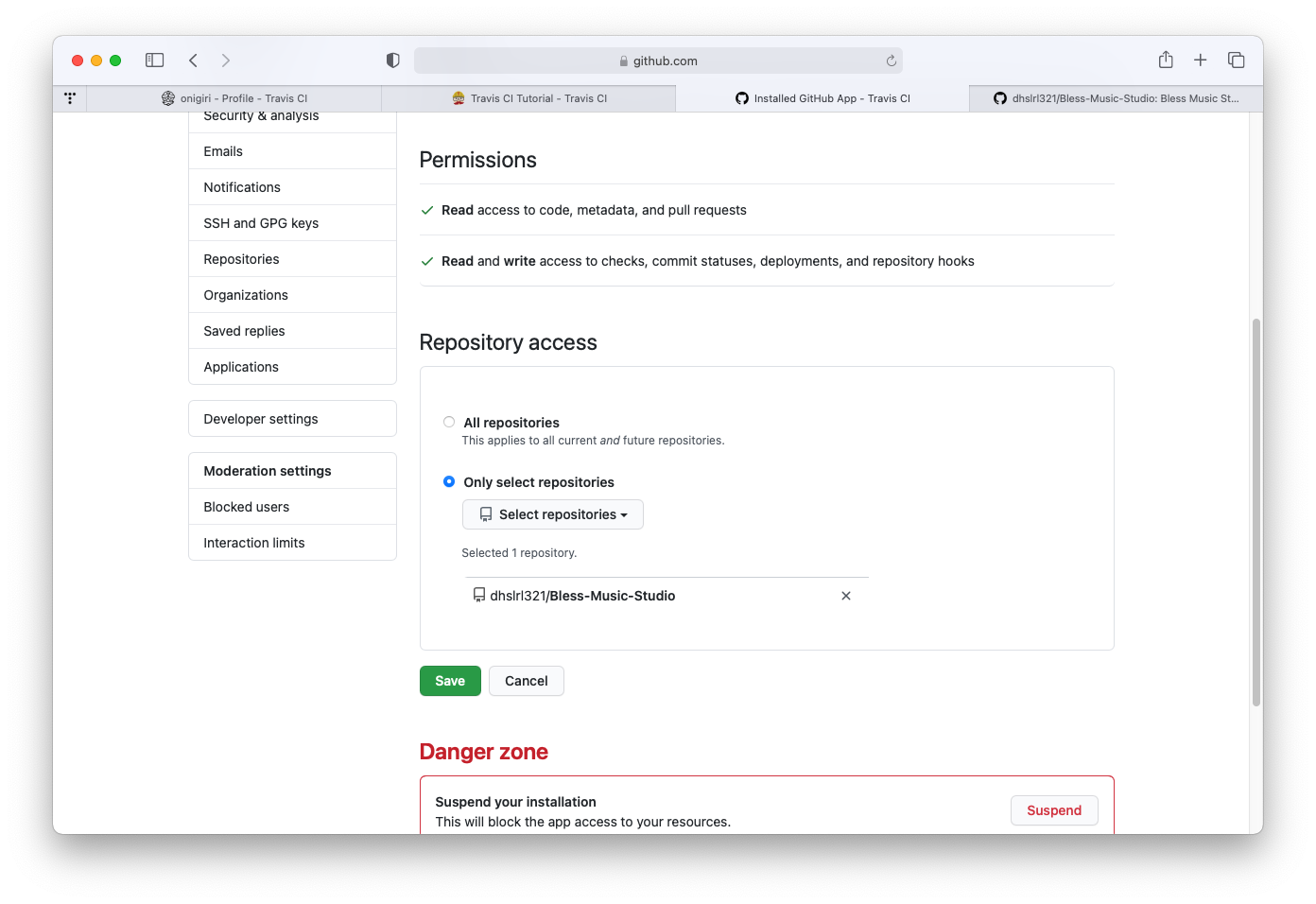 - (Travis์ Github๋ฅผ ์ํธ ์ฐ๊ฒฐํด์ผํ๋๋ฐ, ์ค์ํ ๊ฒ์ ํด๋น ๋ ํฌ์งํ ๋ฆฌ์ Admin ์ด์ด์ผ ๊ฐ๋ฅํ๋ค.)