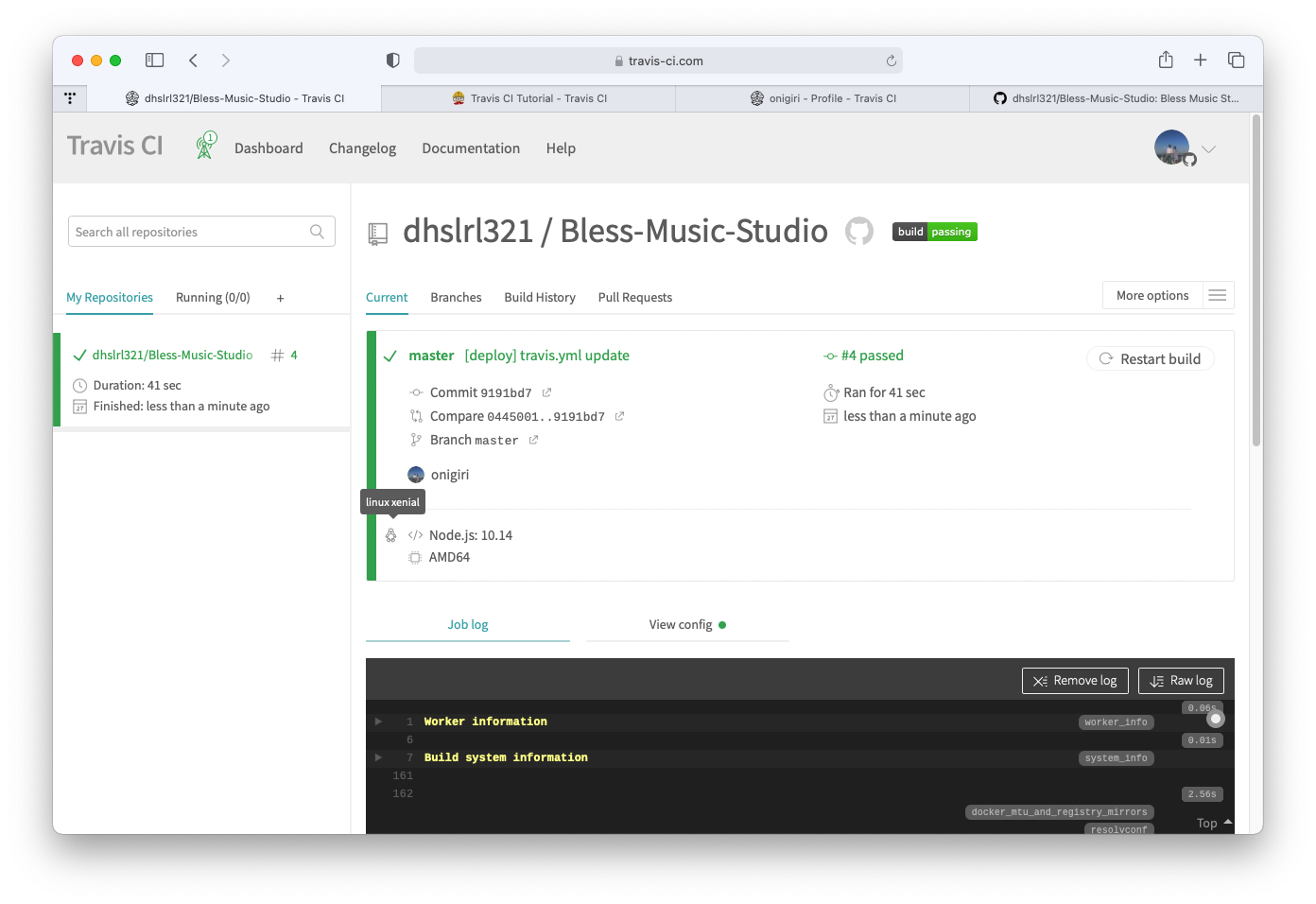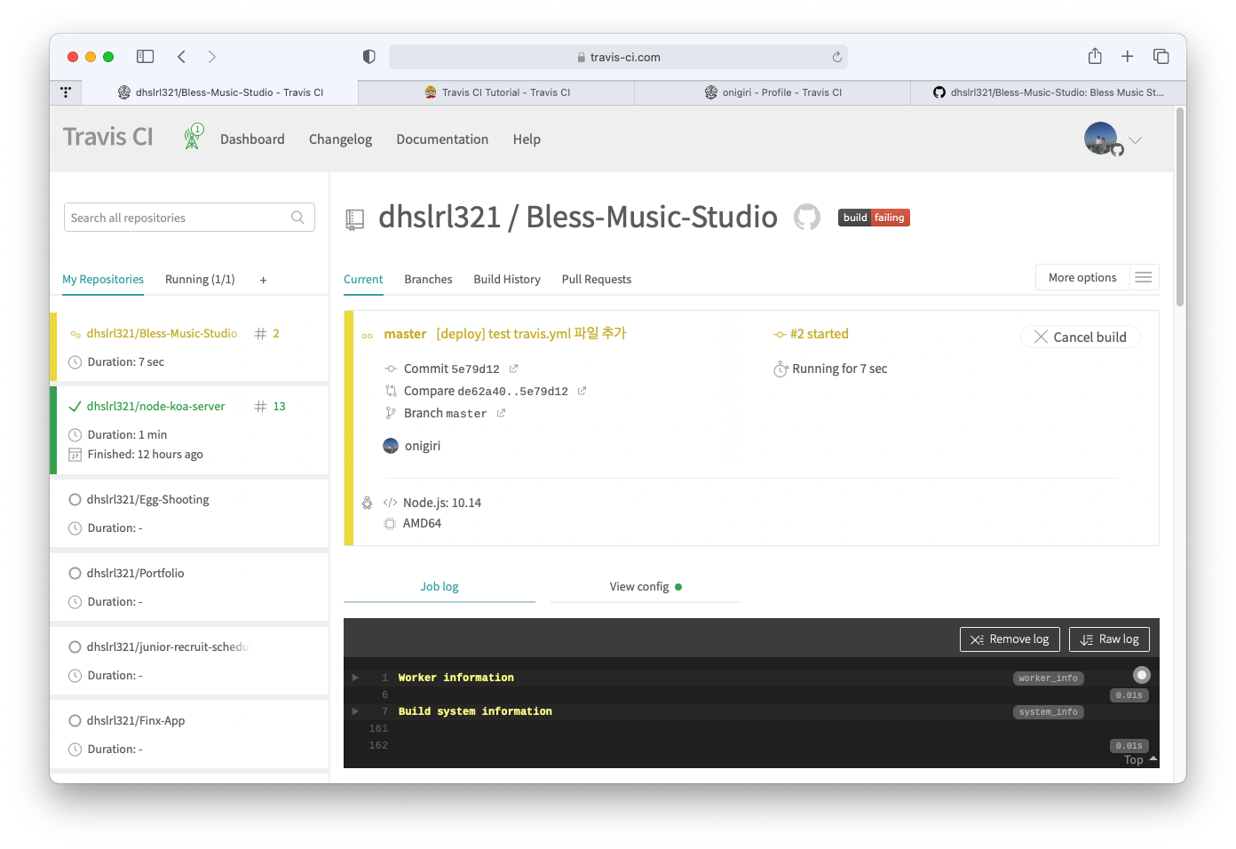 ๊ทธ๋ฆฌ๊ณ ๋ค์ travis ๋ก ๋ณด๋ฉด ๋ ธ๋์์ผ๋ก ๋ฐ๋๊ณ ๊ฒ์ฆ์ ์ํ