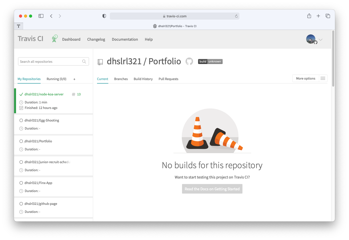 ์์์ Only Select Repository๊ฐ ์๋ All Repository๋ก ๋ชจ๋ ๋ ํฌ๋ฅผ ํ์ฉํ๋ฉด ๋ค์๊ณผ ๊ฐ์ด travis-ci๋ก ๋์์์ ๋, ์ผ์ชฝ ๋์๋ณด๋์ ๋์ github์ ์๋ ๋ชจ๋ ๋ ํฌ๊ฐ ๋ฌ๋ค.