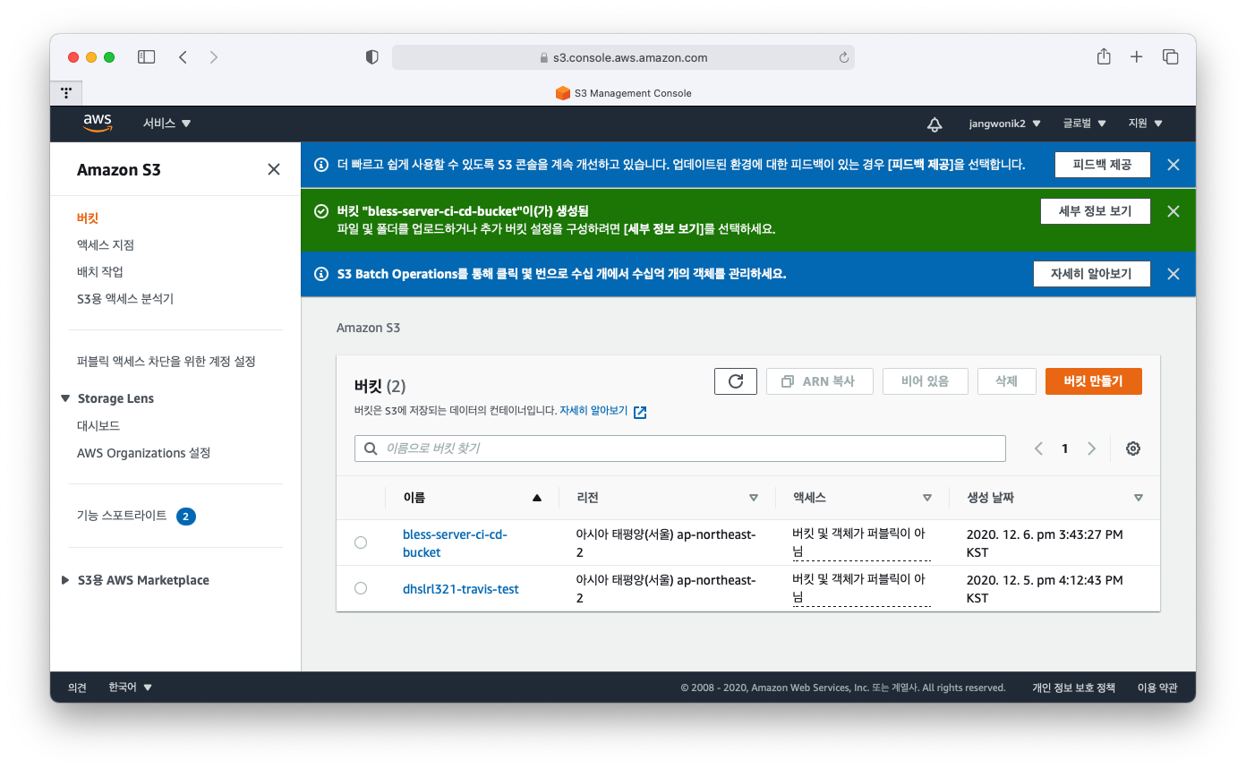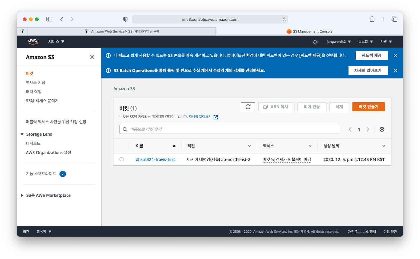 ์ค๋์ S3๋ฅผ Travis CI์ ๋น๋ ์ ์ฅ์๋ก ๋ง๋ค ๋ฒํท์ ๋ง๋ค์ด๋ณผ ๊ฒ์ด๋ค.
