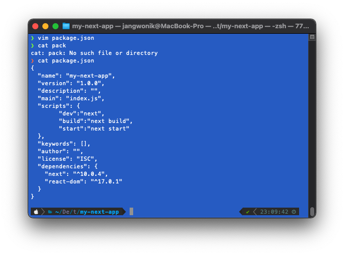vim ์ผ๋ก package.json์ ๋ค์ด๊ฐ๋ฉด script๊ฐ test๋ฐ์ ์๋๋ฐ ๋ค์ 3๊ฐ์ ์คํฌ๋ฆฝํธ๋ฅผ ์ถ๊ฐํด ์ ์ฅํด๋ณด์.