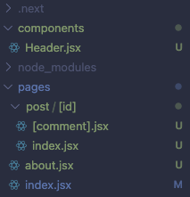 • pages/post/[id]/[comment].jsx => localhost:3000/post/1/first-comment ๊ณผ ๋งคํ•‘๋  jsx ํŒŒ์ผ