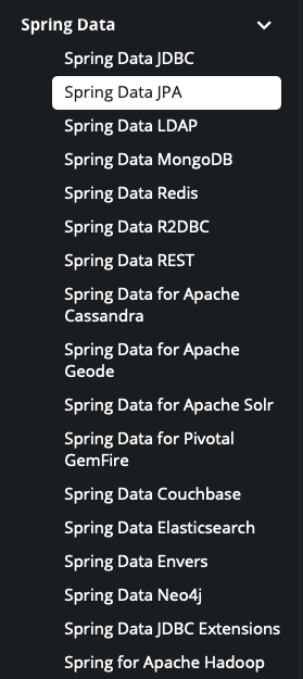 Spring ๊ณต์ ๋ฌธ์์์ Spring Data ํ๋ก์ ํธ๋ฅผ ํ์ธํ๋ฉด ๋ง์ Data ํ๋ก์ ํธ๋ค์ด ์กด์ฌํ๋ค.
