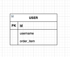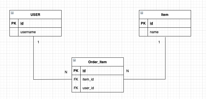 - User ํ ์ด๋ธ ์ ์ฅ์์ ํ ๋ช ์ User๋ ์ฌ๋ฌ Order_Item์ ๊ฐ์ง ์ ์๋ค.