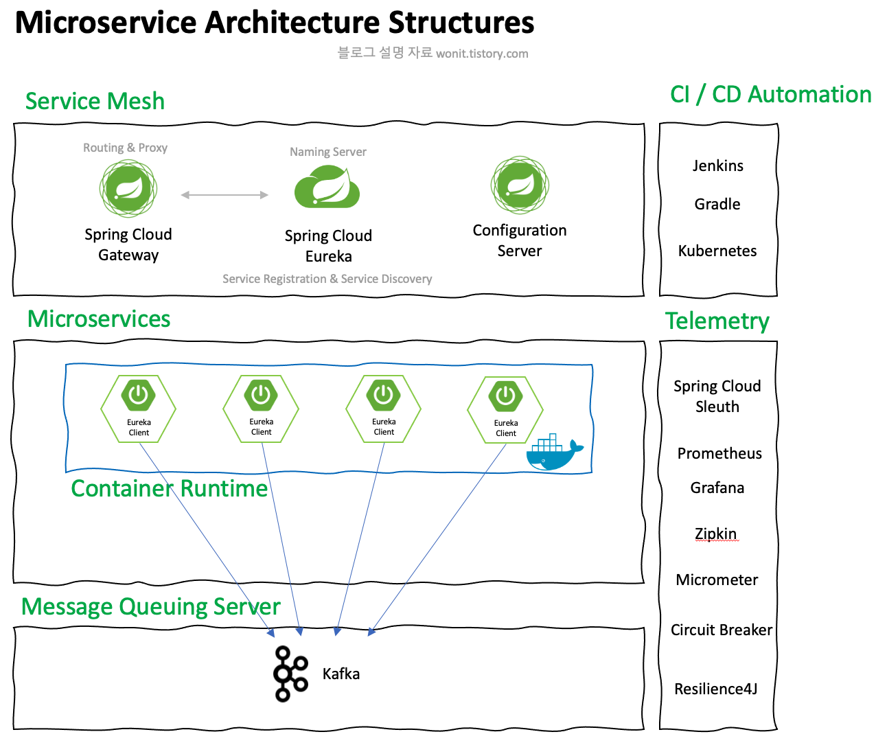 ๋ง์ดํฌ๋ก์๋น์ค๋ ๊ฐ๊ฐ์ ์๋น์ค์ ๋ํ ๊ด์ฌ์ฌ์ ๋ฐ๋ผ ํ๋์ ์๋ฒ๋ ํ๋์ ๊ด์ฌ์ฌ๋ฅผ ๊ฐ๊ณ ์๋น์ค๋ค์ด ๋ชจ์ฌ ํ๋์ ์ปค๋ค๋ ๊ถ๊ทน์ ์๋น์ค๋ฅผ ์ด๋ฃจ๋ ์ํคํ ์ฒ์ด๋ค.