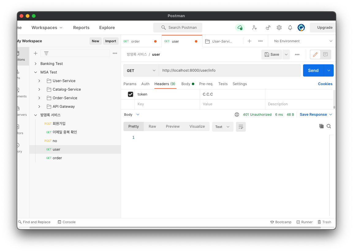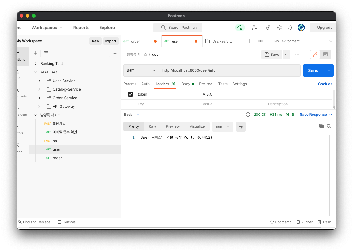 ๊ทธ๋ฆฌ๊ณ Gateway๋ก user service์ GET /info ์์ฒญ์ ๋ณด๋ด๋ณด์.