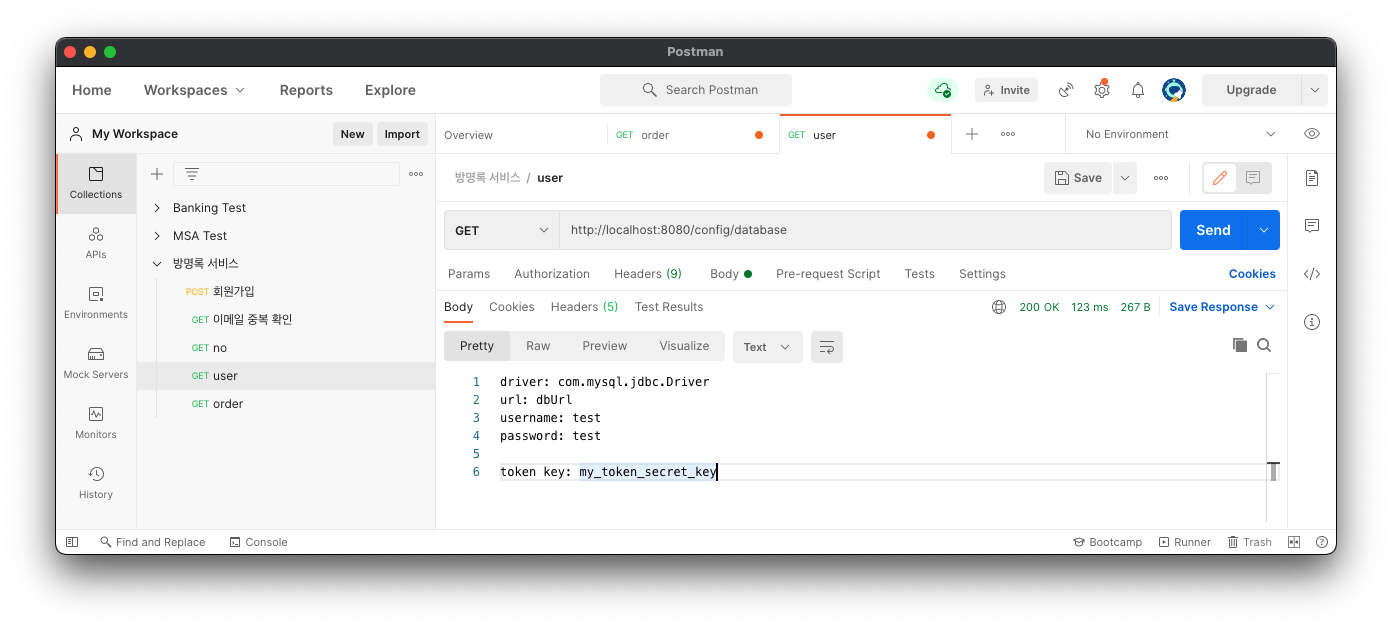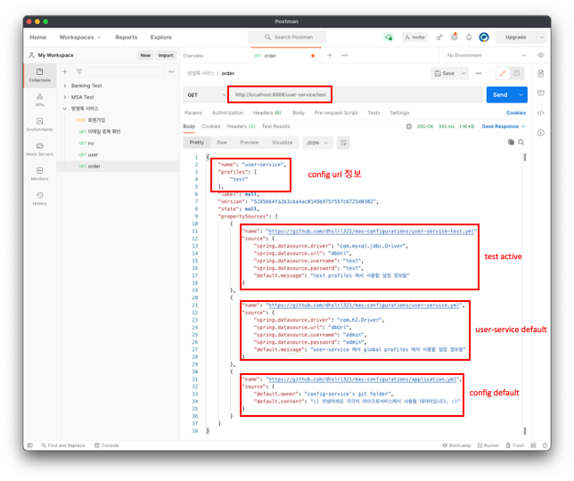 ๊ทธ๋ผ user-service์ ์๋ token ์ ๋ณด์ user-service-test ์ ์๋ datasource ์ ๋ณด๋ฅผ ์ ๋ฐ์์ค๋ ๊ฒ์ผ๋ก ํ์ธ๋๋ค.