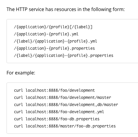 Spring Cloud Config ๋ ๋ค์๊ณผ ๊ฐ์ ์ธ๋ถ ์ค์ ํ์ผ์ 3๊ฐ์ง ์ ๋ณด(name, profiles, label)๋ฅผ URL ๊ฒฝ๋ก์ ๋ฐ๋ผ์ ๊ตฌ๋ถ์ง์ด๋์๋ค.