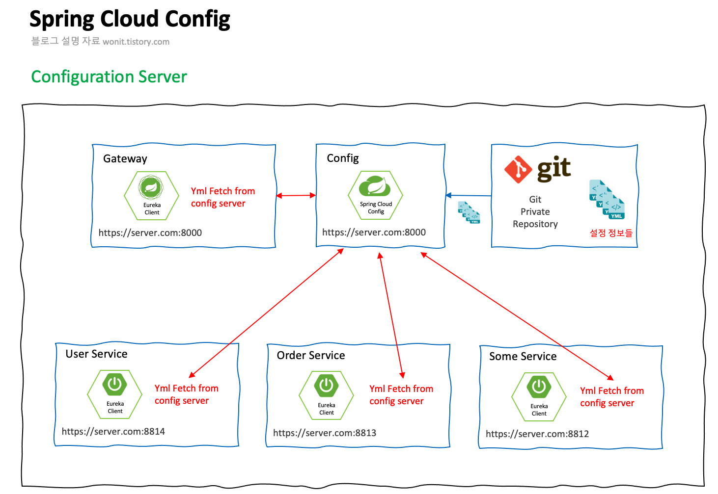 ํ์ฌ Config ์๋ฒ์ ๋ง์ดํฌ๋ก์๋น์ค๋ค์ ์๋์ ๊ฐ์ ๊ตฌ์กฐ๋ก ๋์ด์๋ค.