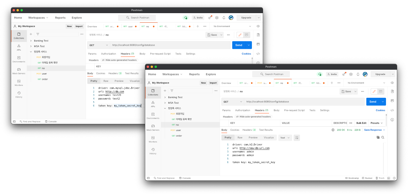 ์ฐ์ ํด๋น ์ค์ต์ ์ํด์๋ Spring Config ์๋ฒ์ User-service๊ฐ ๊ธฐ๋๋์ด ์์ด์ผ ํ๋๋ฐ, ๋ง์ฝ Config ์๋ฒ์ ๋ง์ดํฌ๋ก์๋น์ค๊ฐ ์ค์ ๋ณ๊ฒฝ์ ํ์ธํ ์ ์๋๋ก ํ๊ฒฝ์ด ๊ตฌ์ถ์ด ๋์ด์์ง ์๋ค๋ฉด Spring Cloud Config์ name, profiles ๊ทธ๋ฆฌ๊ณ Github ๋ฅผ ์ฐ๋ํด์ ์ค์ ํ์ผ ๊ด๋ฆฌํ๊ธฐ ์์ ํ์ธํ ์ ์๋ค.