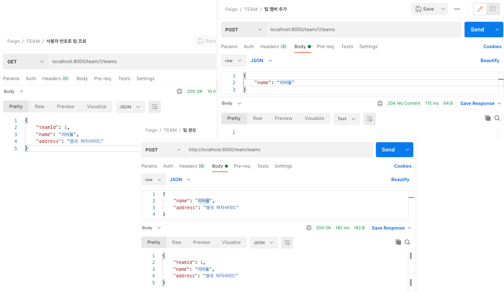 ์ด์ Team-Service์ ๋น์ฆ๋์ค ๋ก์ง์ ๋ค ๊ตฌํ์ด ๋์์ผ๋ API Tester๋ก ํ ์คํธ๋ฅผ ํด๋ณด์.