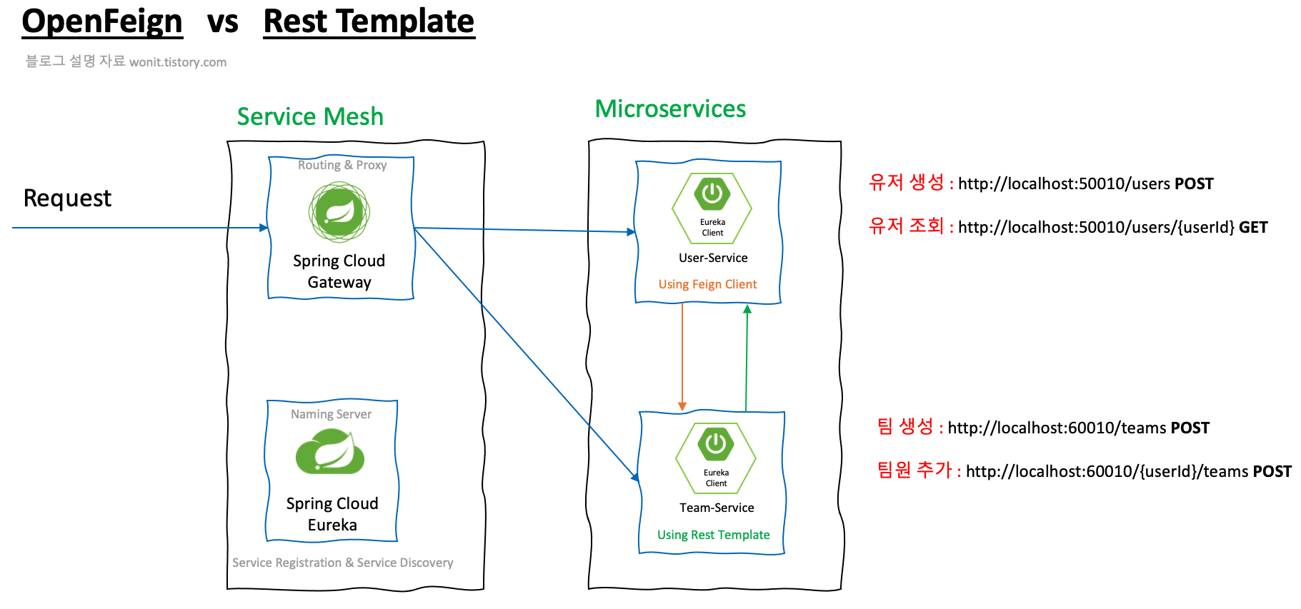 - ๋ง์ดํฌ๋ก์๋น์ค์์ ์๋น์ค๊ฐ ํต์ ์ ์ํ 2๊ฐ์ง ๋ฐฉ๋ฒ ๋น๊ต [OpenFeign vs Rest Template] - ๊ฐ๊ฐ์ ๋น๊ต