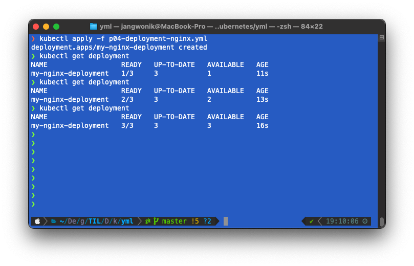 ๊ทธ๋ผ ์์ ๊ฐ์ด kubectl get deployment์ ์ํํ์ฌ ์ํ๋ฅผ ํ์ธํ๋ฉด ์์ฐจ์ ์ผ๋ก ํฌ๋ 3๊ฐ๊ฐ ์ฌ๋ผ์ค๊ฒ ๋๋ค.