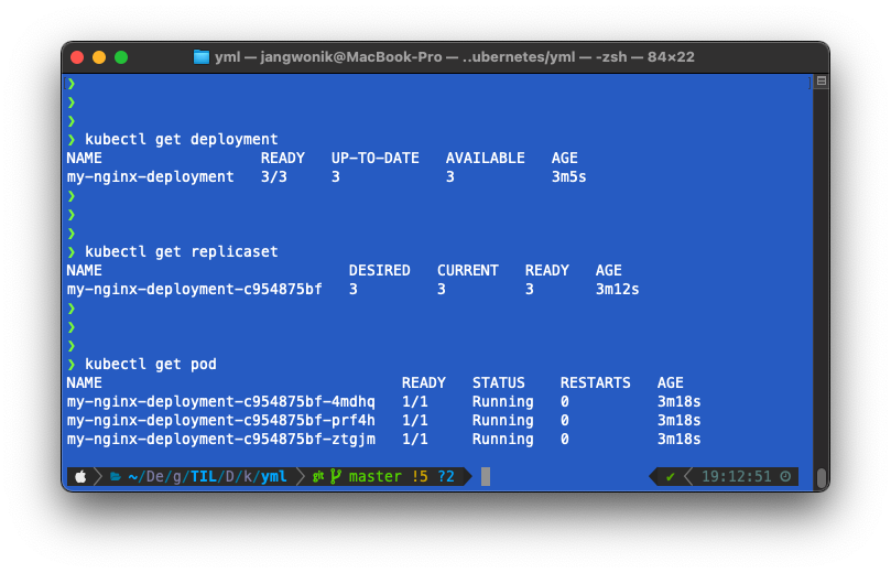 ์ ๋ณด๋ฅผ ํ์ธํ๊ธฐ ์ํด์ kubectl get deployment, replicaset, pod ๋ช