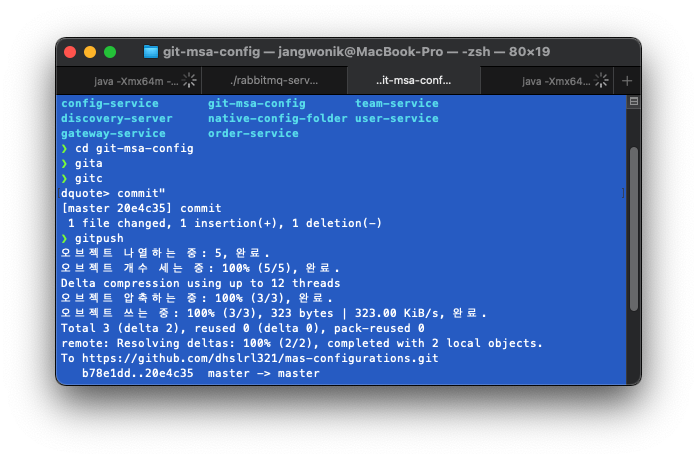 - Rabbit MQ -> Config Service -> Microservices ๋ฅผ ์ฐจ๋ก๋ก ์คํ์ํค๊ธฐ