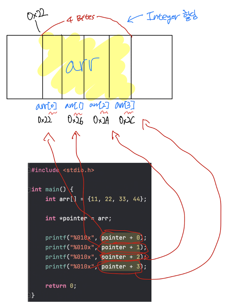 pointer ๋ณ์์ ์ ์๋ฅผ ๋ํ๋ค๋ ๊ฒ์ ํฌ์ธํฐ ๋ณ์์ ๋ฐ์ดํฐ ํ์ ๋งํผ์ byte ๋ฅผ ๋ํ๋ค๋ ์๋ฏธ๊ฐ ๋๋ค.