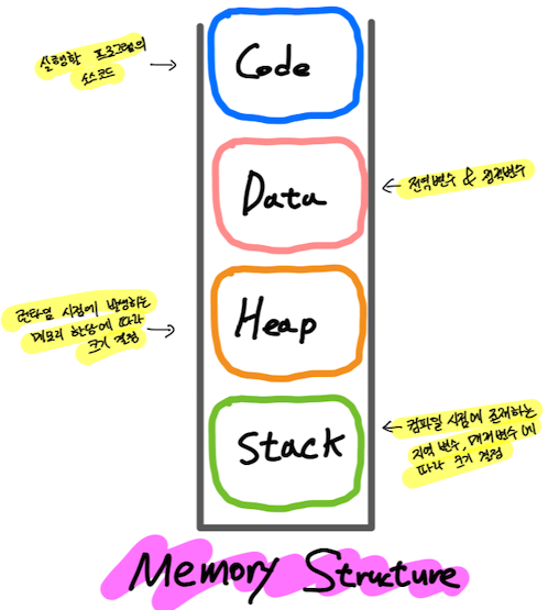 ์ด๋ฅผ ์ดํดํ๊ธฐ ์ํด์ ์ง๋ ์๊ฐ์ ์ด์ผ๊ธฐ ํ ๋ฉ๋ชจ๋ฆฌ ๊ตฌ์กฐ์ ๋ํด์ ๋ค์ ํ ๋ฒ ์๊ธฐํด๋ณด์.