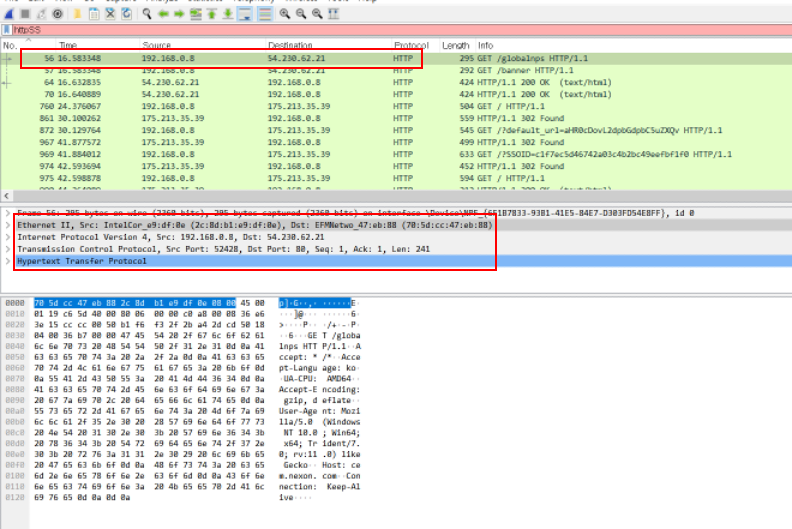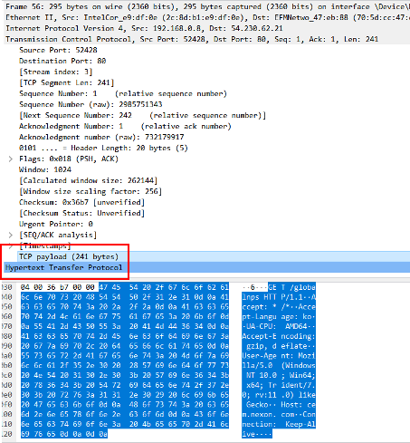 νμ§λ§ νμ¬ μ‘μ ν¨ν·μ http ν¨ν·μ΄λ―λ‘ TCP Payload μλ Hypertext Transport Protocol μ΄ μ‘΄μ¬νλ κ²μ λ³Ό μ μλ€.