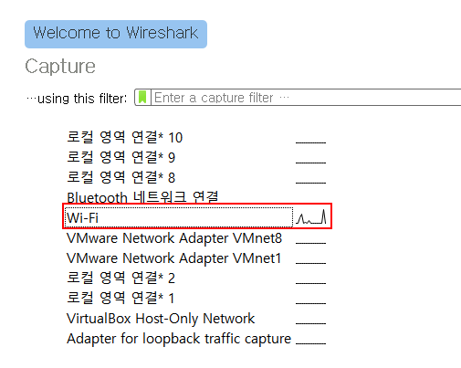 μ°μ λ€νΈμν¬ ν¨ν·μ μΊ‘μ³νκΈ° μν΄μ Wireshark λ₯Ό μ΄μ©ν κ²μ΄λ€.